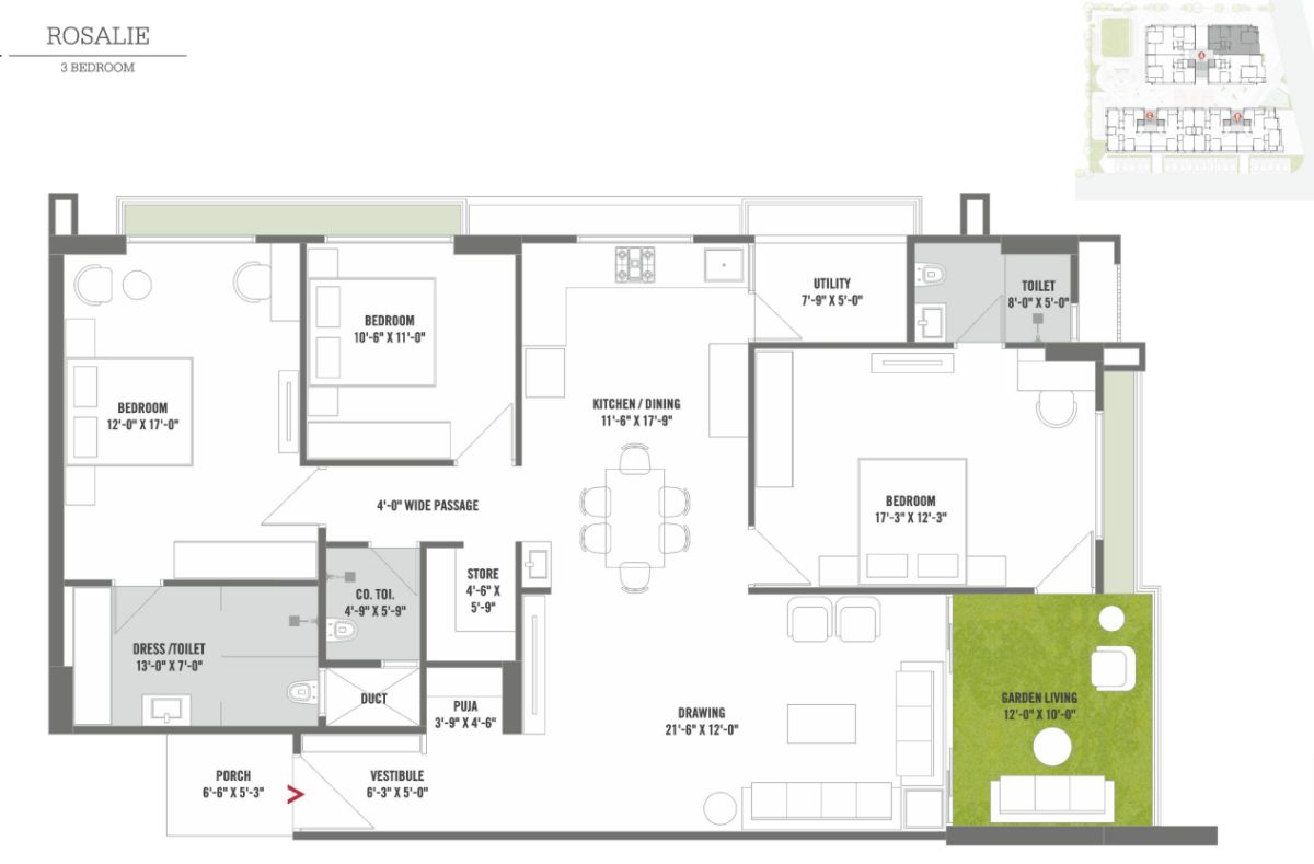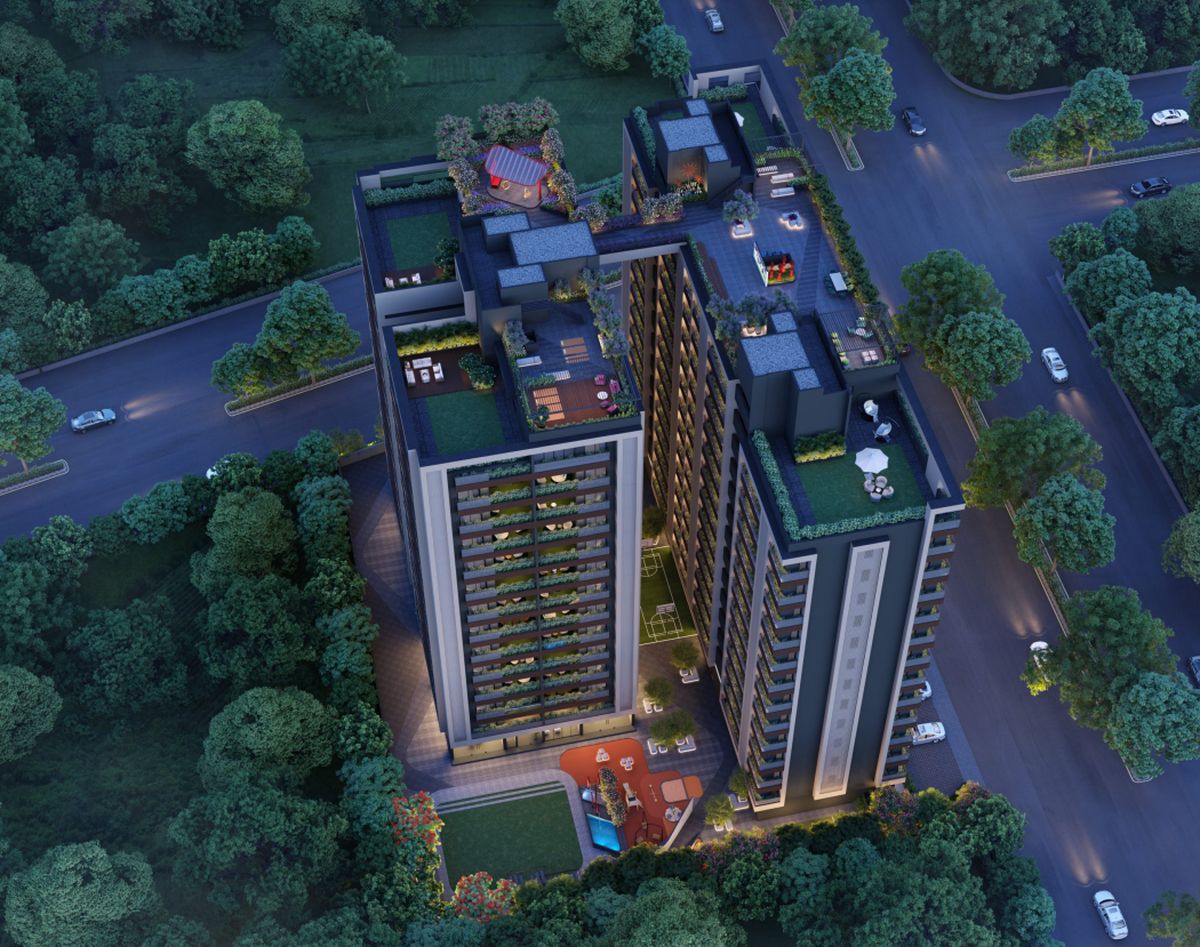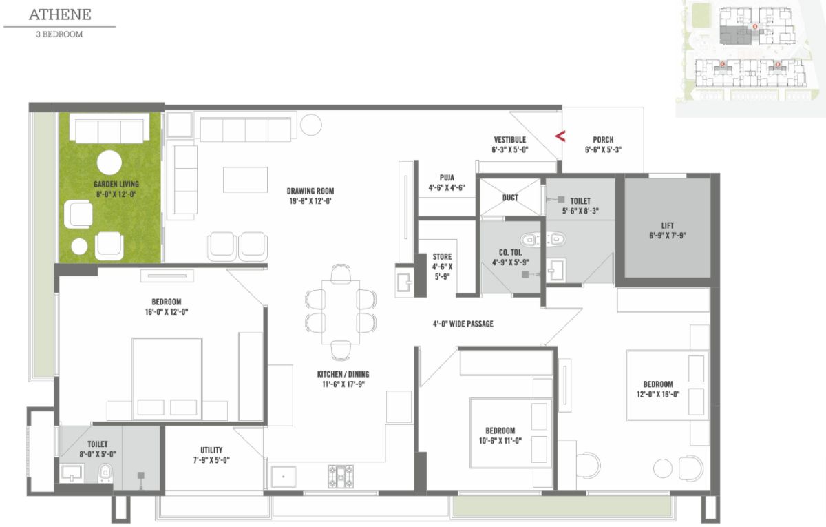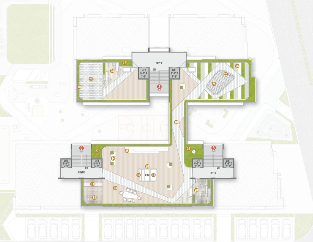 SALIENT FEATURES : High Speed Elevators • Three Level Basement • No Vehicle Zone @ Ground Floor • Private Porch for each Apartment • Garden Living Balcony with Decorative Ceiling • Gated Community • Separate Borewell for Commercial and Residence Use • Solar System for Common Area