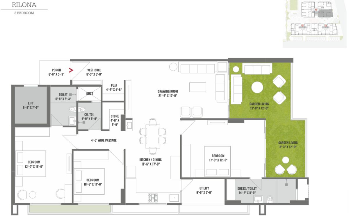 FLOORING : 800 x 1600 mm Vitrified tiles in drawing, kitchen, and dining area. .600 x 1200 mm Vitrified tiles in all bedrooms. • Wooden finish tiles and artificial lawn in garden living balcony.