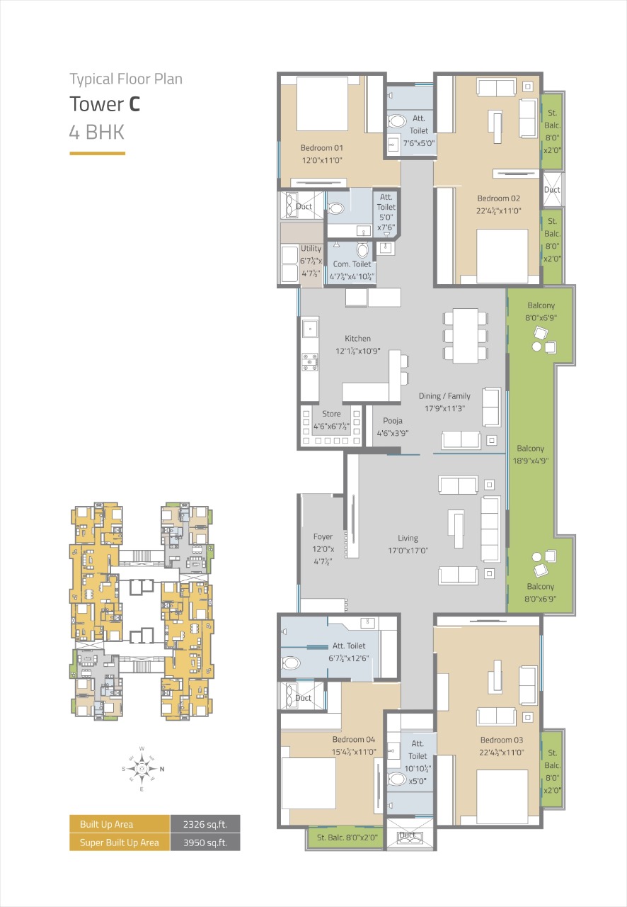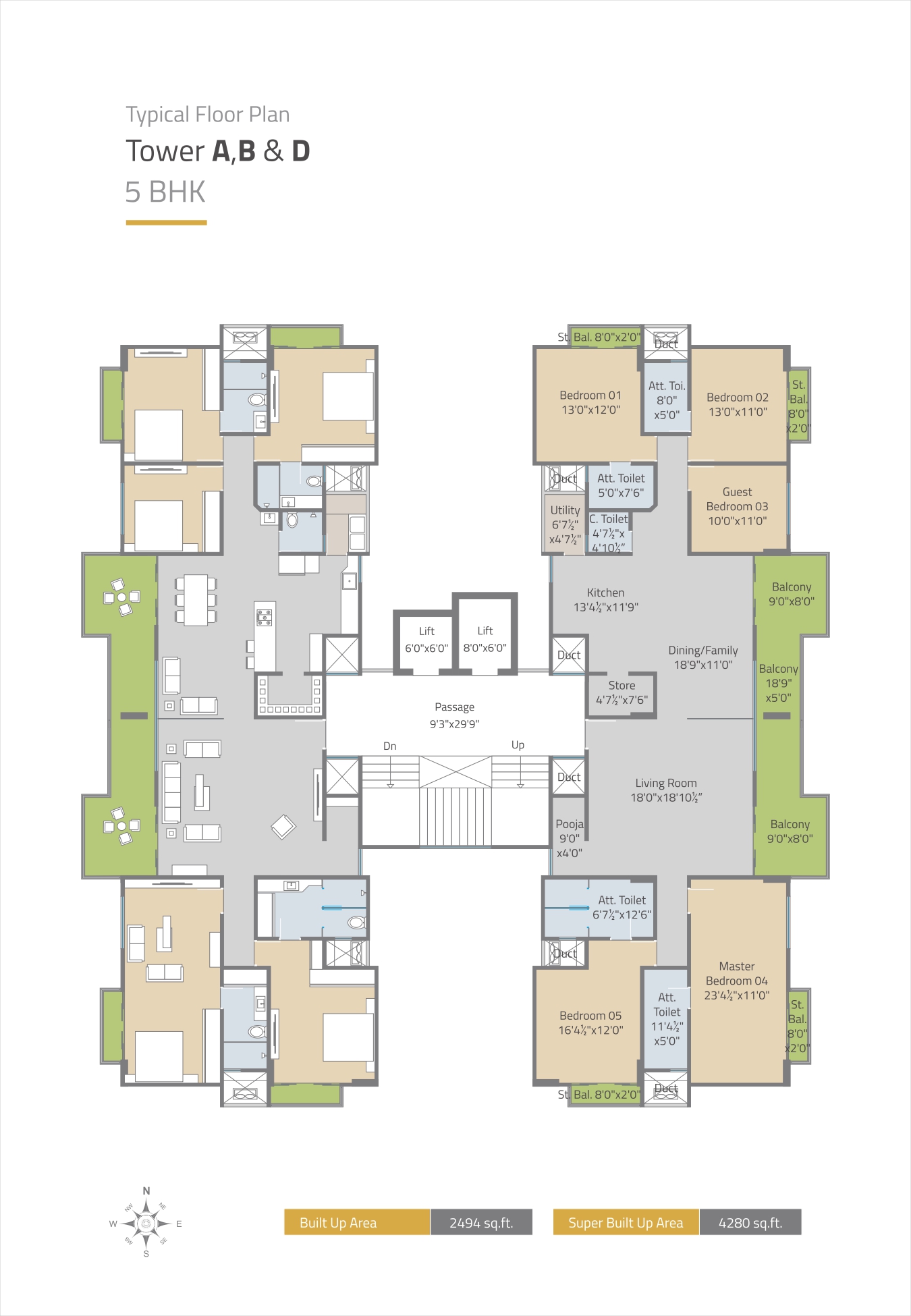 4 BHK Apartment Built-up Area 2326 - 2494 sq.ft.