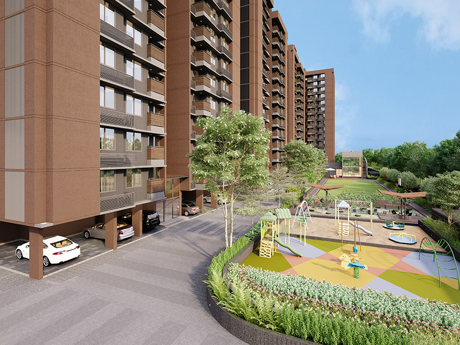 The ground space is utilized magnificently, involving all the amenities that you require and can think of! With a colorful kid’s play area to cozy sit-out spaces to a lavish green lawn, the visual expanse and beautiful view enchants you and captivates your senses, instantaneously.