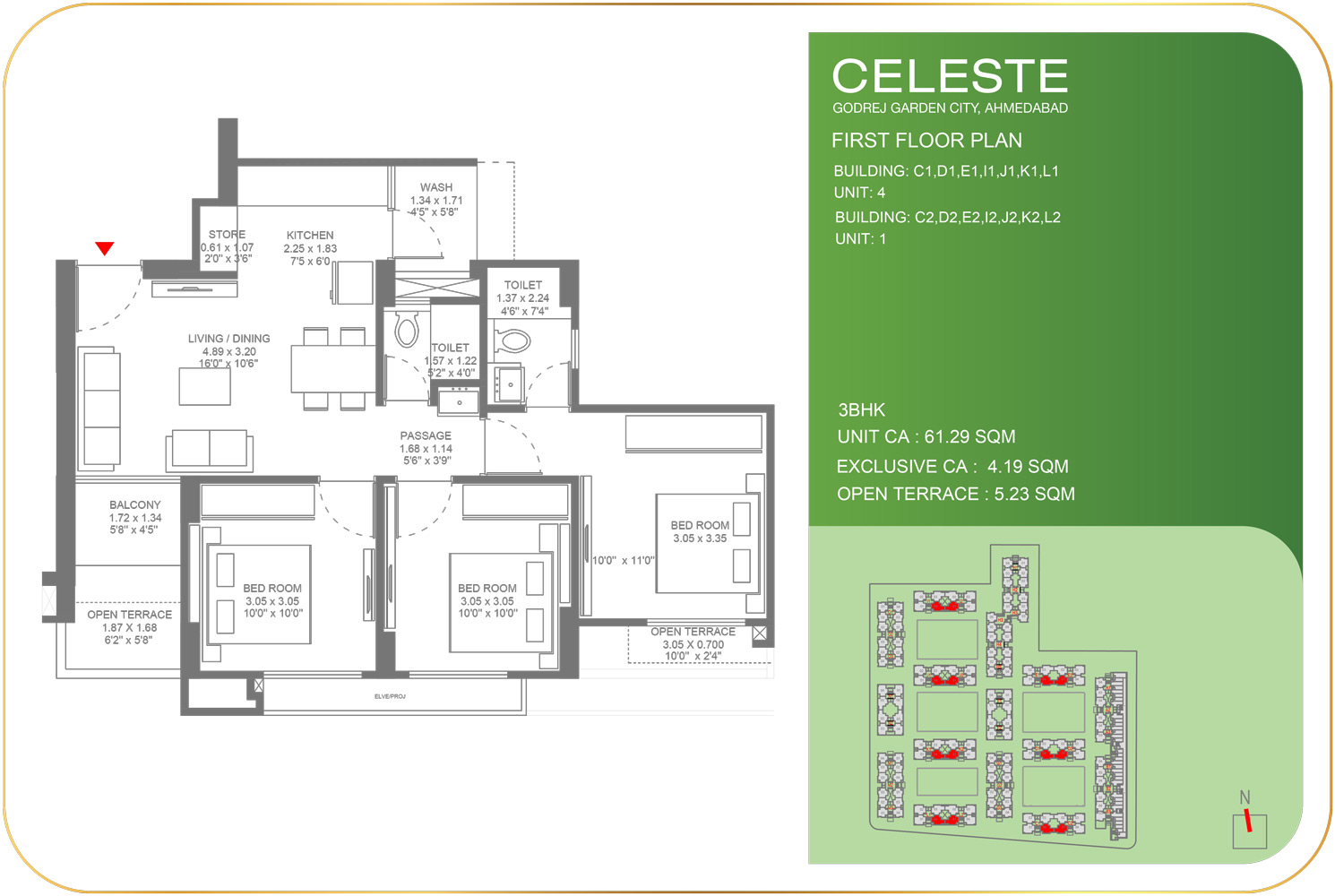 - 3 BHK :- 60.82 – 61.51